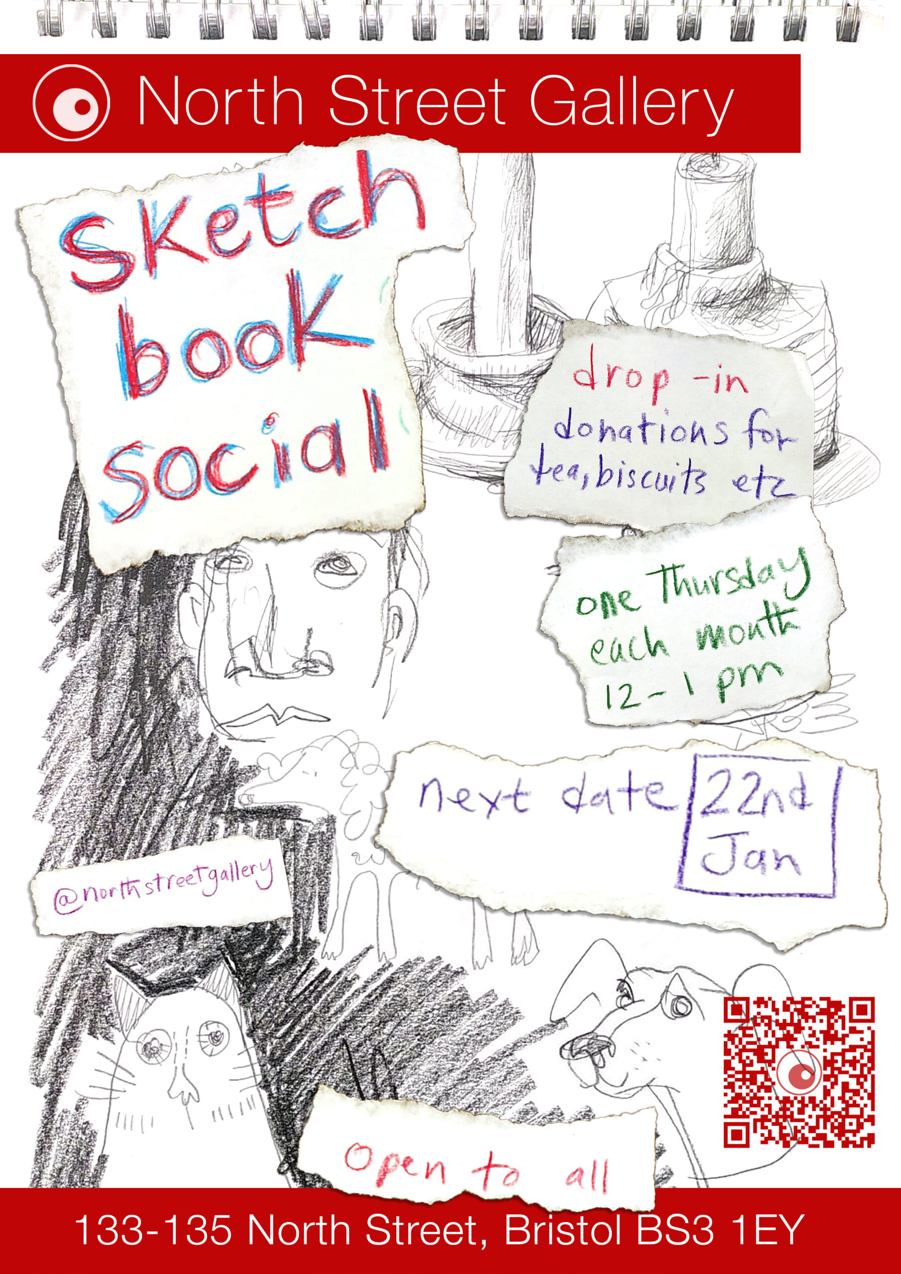 The Sketch-Book Social will happen one Thursday each month, 12-1pm. We’ll let you know which Thursday on our socials, our website and with a poster in our window.